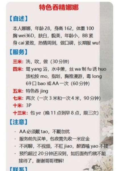 、保证金、照片验证、视频验证等任何提前付费的行为;以及引导下载APP,千万不要上当。同时也请注意仙人跳,在寻欢前不要露富和带过于贵重随身物品。本站只提供整合信息平台并不对寻欢经历负责,被骗一概与本站无关。信息真假请自行甄别,碰到有问题的信息,请及时举报给我们删除信息。