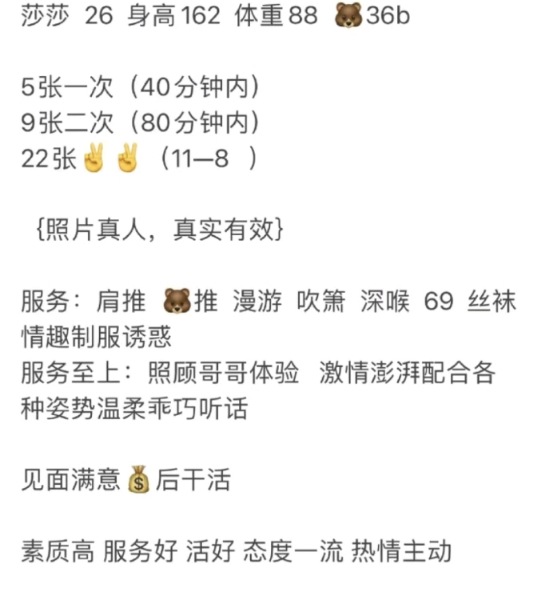 、保证金、照片验证、视频验证等任何提前付费的行为;以及引导下载APP,千万不要上当。同时也请注意仙人跳,在寻欢前不要露富和带过于贵重随身物品。本站只提供整合信息平台并不对寻欢经历负责,被骗一概与本站无关。信息真假请自行甄别,碰到有问题的信息,请及时举报给我们删除信息。
